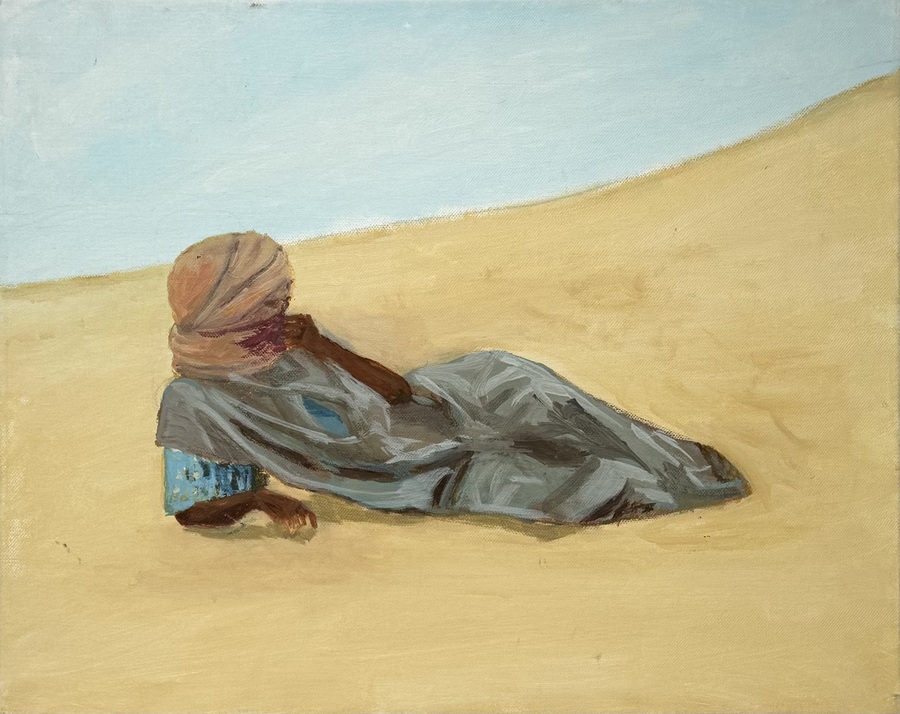 Schilderij getiteld “Man in het zand” door Diane Vellinga. Acrylverf op linnen, verso informatie, 21e eeuw.