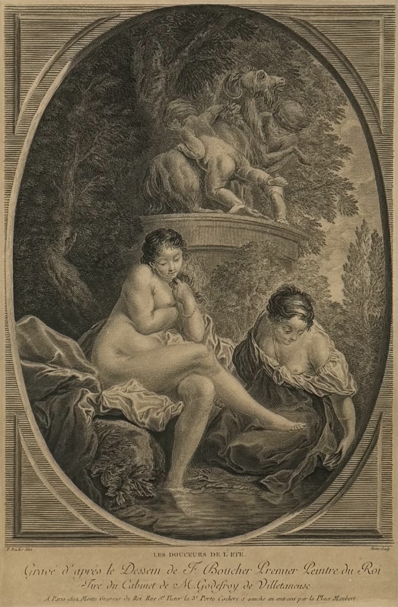 Kopergravure getiteld “Les douceurs de l'été” door graveur Pierre Etienne Moitte (1722-1780) naar een schilderij van Francois Boucher. Frankrijk, eind 18e eeuw.