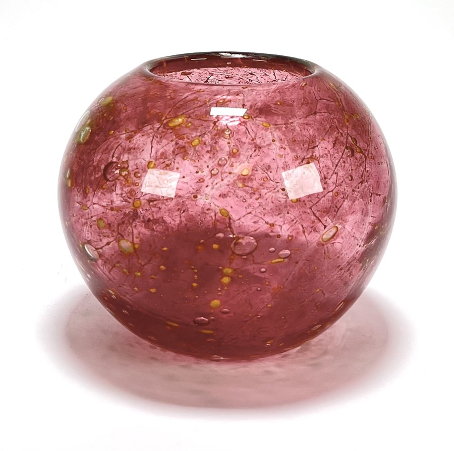 Kristallen donkerroze bolvaas met amberkleurige ingesloten luchtbellen. Bohemen, Tsjechië, 20e eeuw.