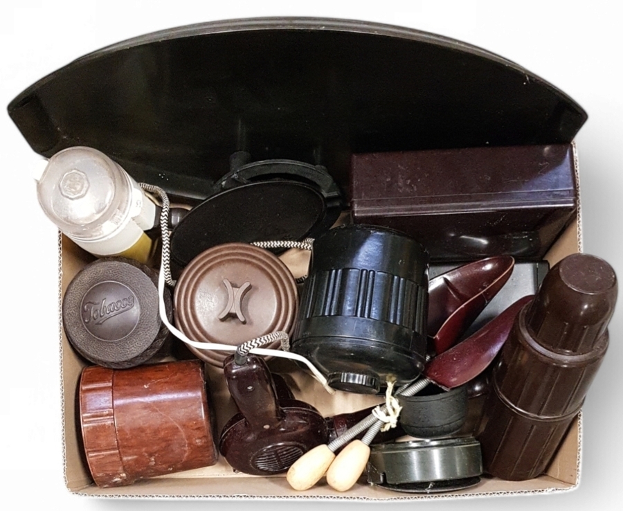 Verzameling bakeliet waaronder schoenspanners en een thermoskan, 20e eeuw.