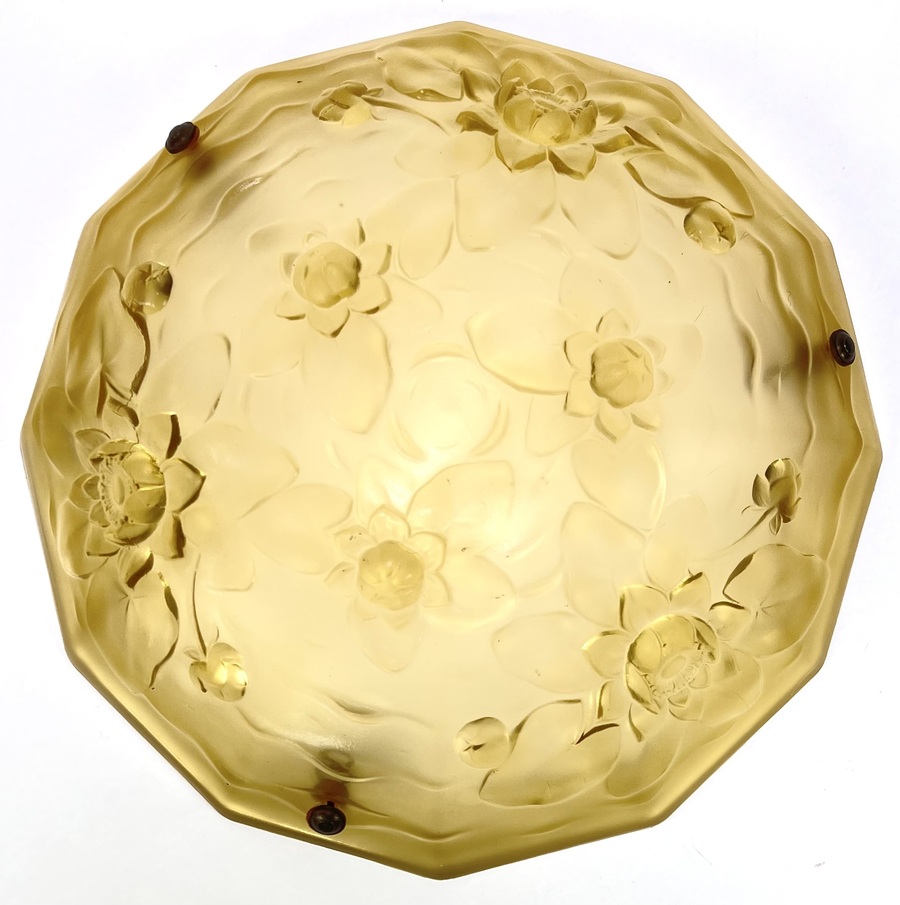 Donkergele Art Deco floraal gedecoreerde glazen hanglamp schaal. Frankrijk, jaren 30.