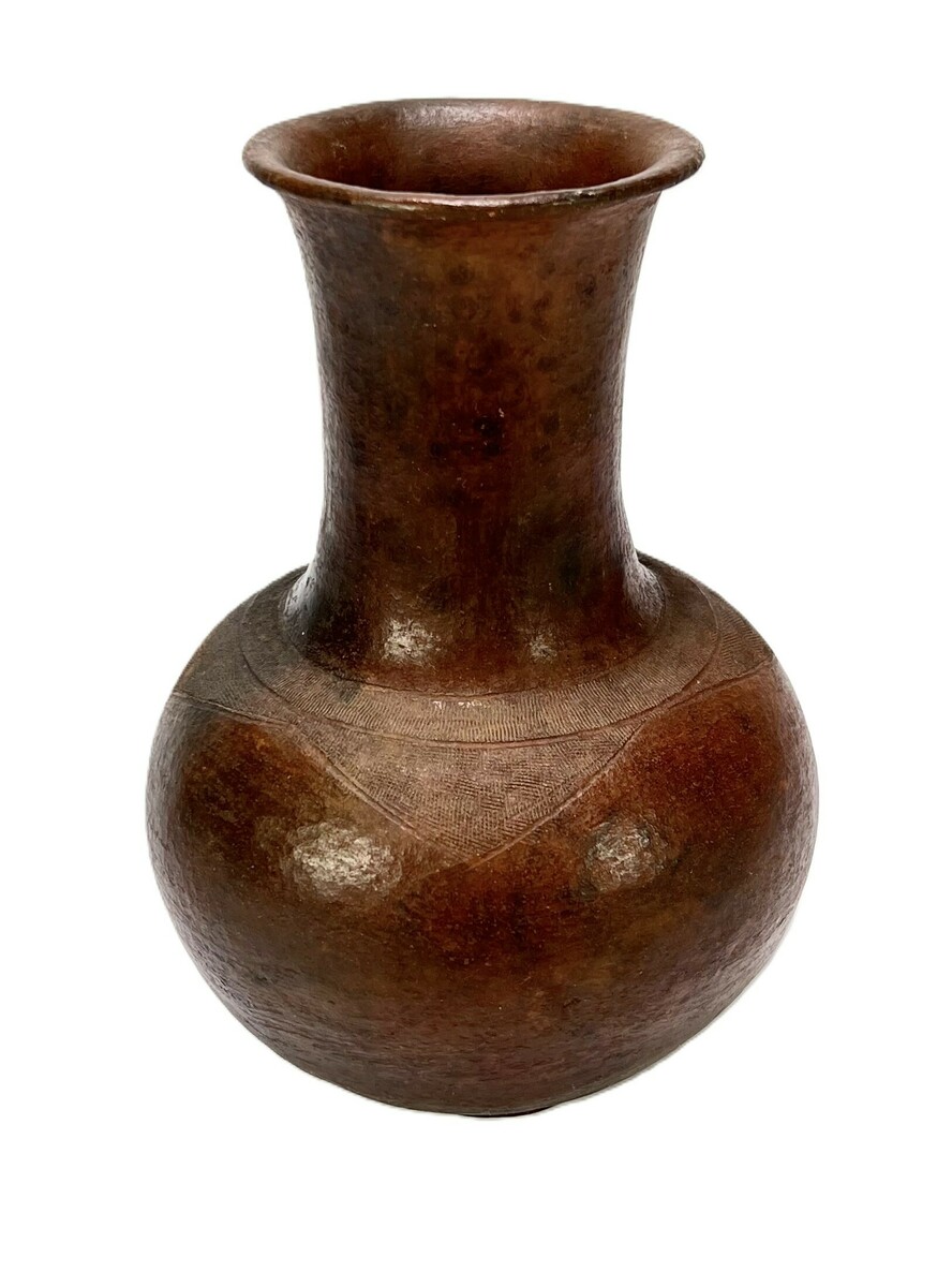 Bruine aardewerken Latijns-Amerikaanse pot met verfijnd ingekrast decor. 18e eeuw.
