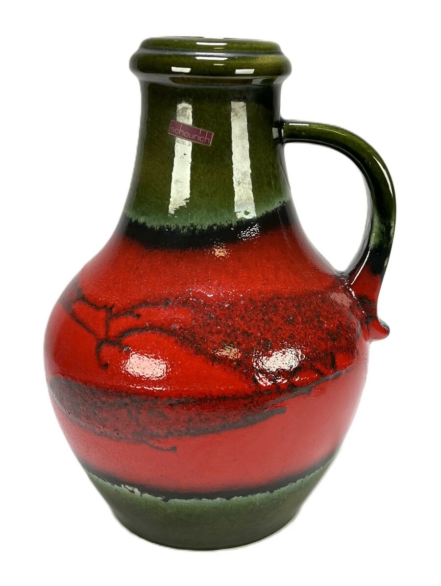 Keramieken rood-groen geglazuurde West Germany vloervaas van Scheurich met handvat. Aan de onderzijde gemerkt en vermelding van modelnummer 423-42. Duitsland, jaren 70.