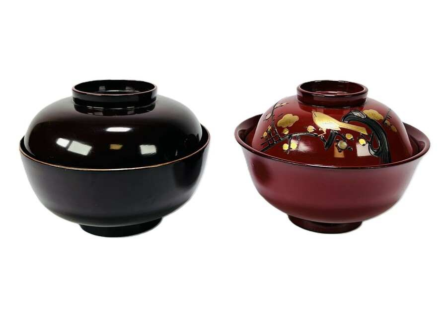Twee lakwerk kommen voorzien van een traditionele lakcoating en gouden maki-e versiering. Japan, midden 20ste eeuw.