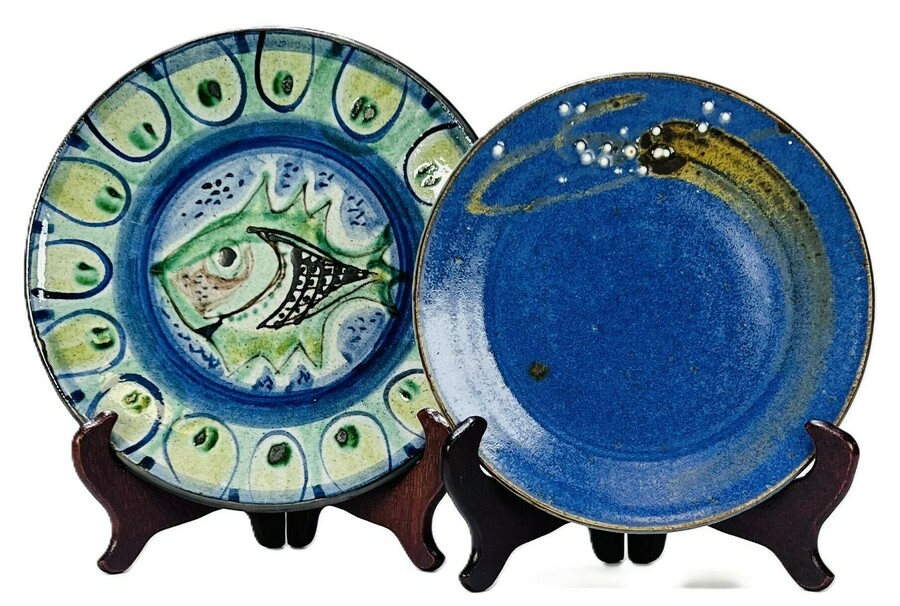 Twee keramieken borden; een met vis gedecoreerd bord door RAS Keramik, Made in Denmark en een blauw bord met witte stippen decor door Tøddepotte, Fyresdal, Zweden, jaren 60/70.