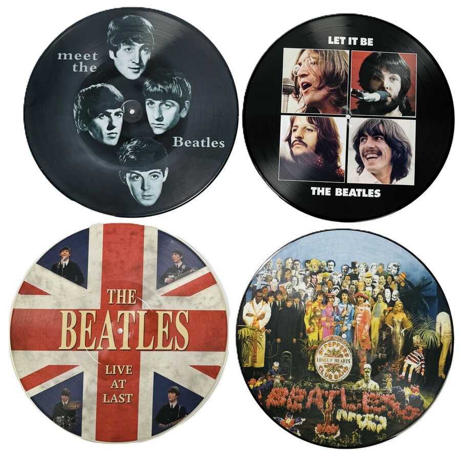Vier picture discs elpees van The Beatles; gelimiteerde editie 440/500 van “Live art last” uit 2021, “Let is be” uit 2021, "Lonely Hearts club band" en "Meet The Beatles", 21e eeuw.