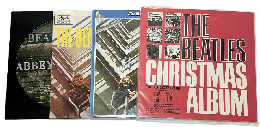 Vier elpees van The Beatles; de groene vinyl uitgave "Christmas Album" uit 1970, het "Bleu" dubbelalbum (1967-1970) en “Please Please Me”; jaren 70 en een picture disc elpee “Abbey Road” 21e eeuw.