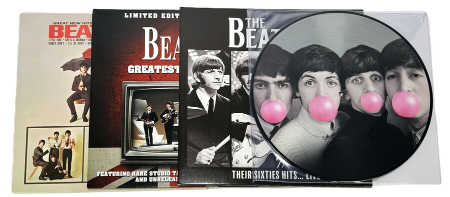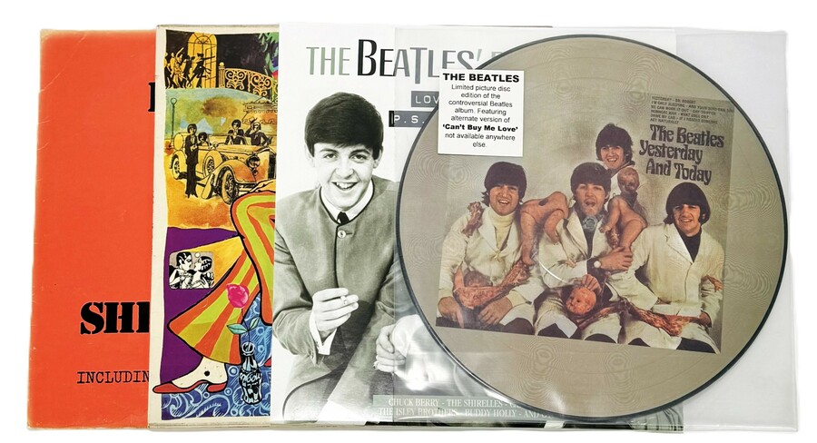Vier elpee albums van The Beatles; “A Collection of Beatles” uit 1966, “The Beatles Live at Shea-Stadion” uit 1964, "The Beatles first single Love me do" met overige artiesten en een picture disc elpee “The Beatles “Yesterday … and today”, 21e eeuw.