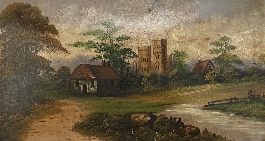 Schilderij met dorpsgezicht met twee huizen en ruïne, olieverfschilderij op karton. Anoniem, tweede kwart 20e eeuw.