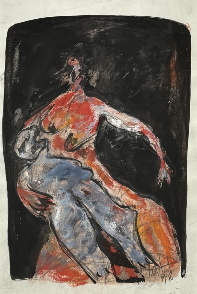 Schilderij van een zittende vrouw in neo-expressionistische stijl. Gemengde techniek, acryl op papier, rechtsonder met potlood gesigneerd en gedateerd 1998.