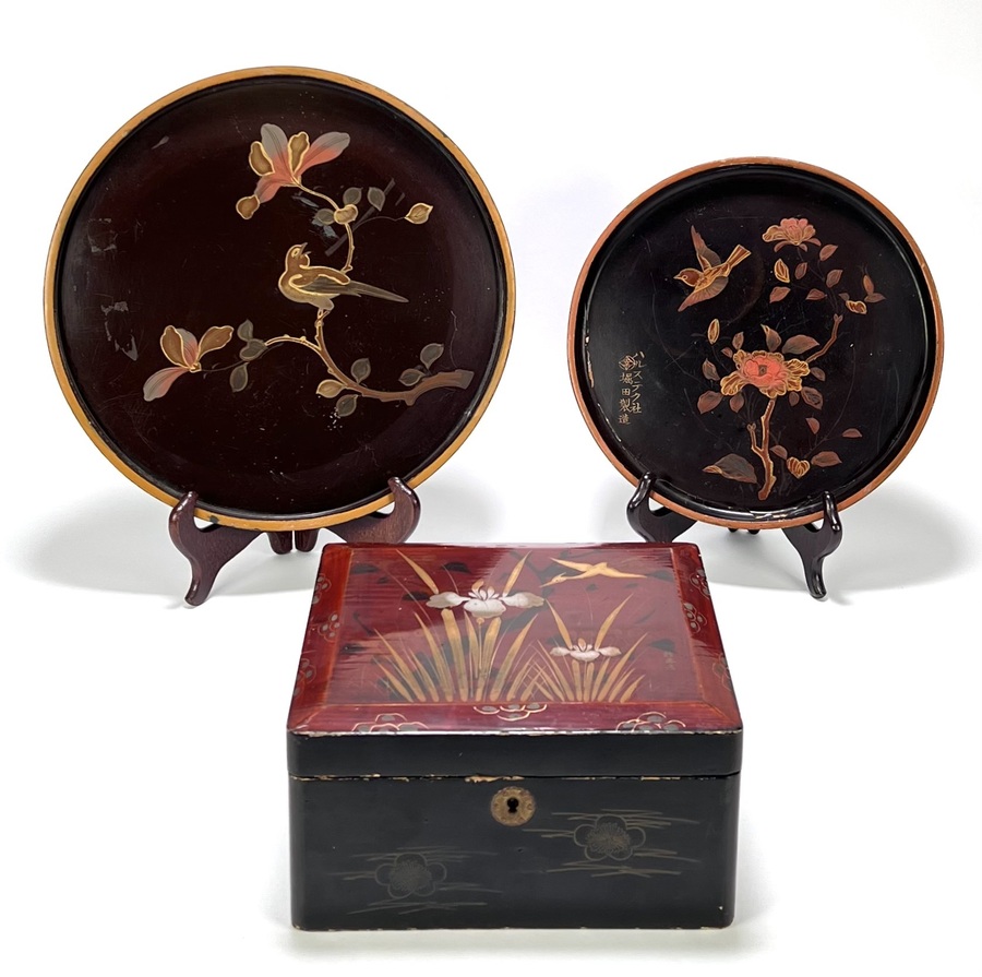 Drie lakwerk objecten; een dekseldoos gedecoreerd met irissen en vogel en twee dienbladen met botanisch en vogel decor. China, eerste helft 20e eeuw.