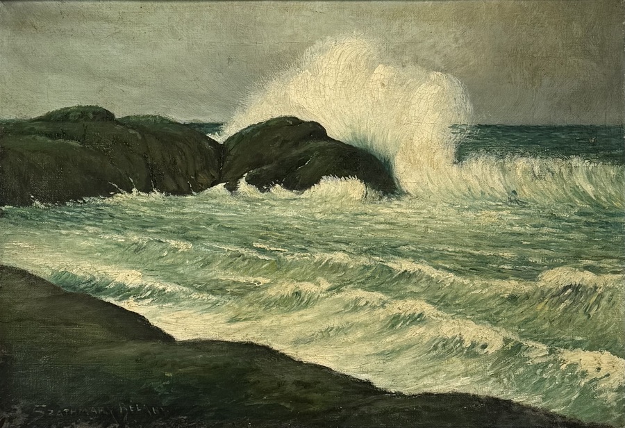 Schilderij van een zeegezicht door Szathmary Relany. Olieverfschilderij op linnen, linksonder gesigneerd, midden 20e eeuw.