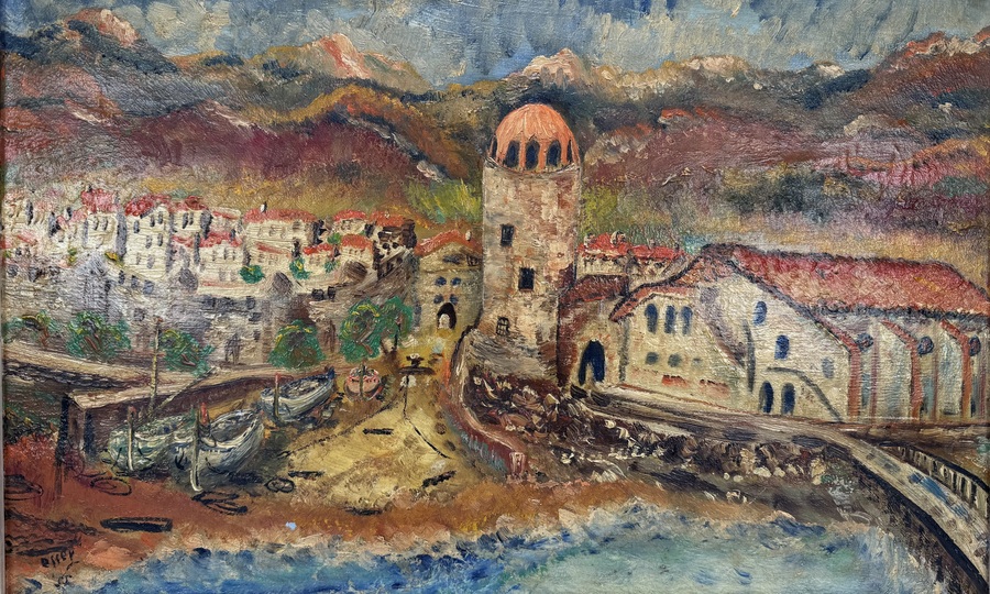 Schilderij van een Zuid-Europees kustgezicht met stad. Olieverfschilderij op linnen, linksonder gesigneerd en gedateerd 1955.