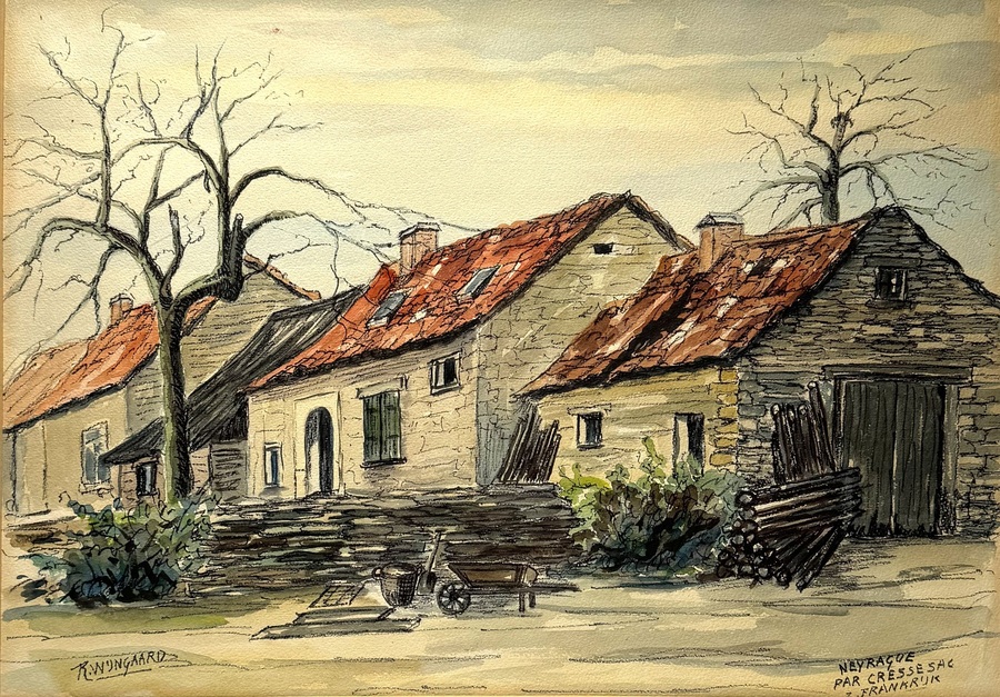 Aquarel van huizen in Frankrijk door R. Wijngaard. Rechtsonder gesigneerd, tweede helft 20e eeuw.