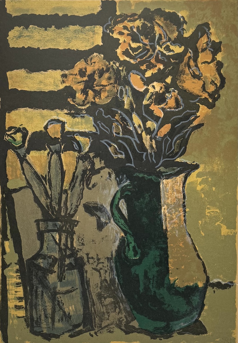 Kleurenlitho van een bloemstilleven door Ruud J.M. Verspyck (1897-1966). Rechtsonder gemonogrammeerd RV, jaren 60.