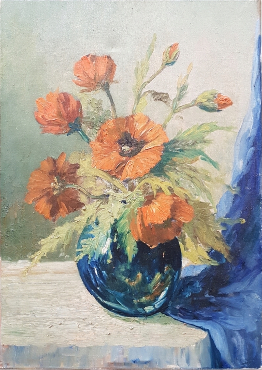 Schilderij met een bloemstilleven, olieverf op doek. Ongesigneerd, 2e helft 20ste eeuw.
