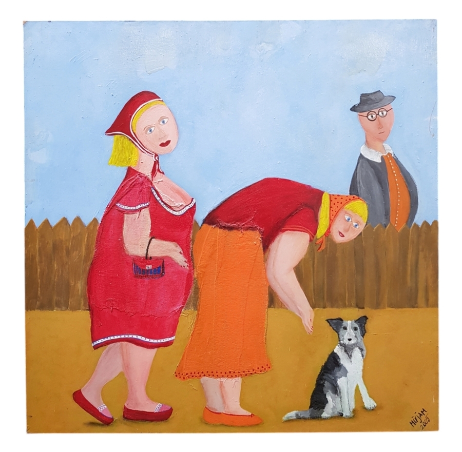 Schilderij met een naïeve voorstelling van twee vrouwen, man en hond. Acryl op board, linksonder gesigneerd Mirjam 2005.