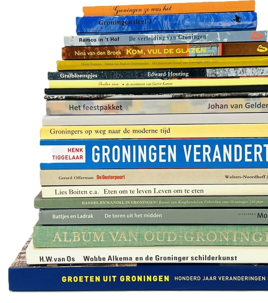Convoluut van twintig boeken over Groningen waaronder Groeten uit Groningen, Wobbe Alkema en de Groninger schilderkunst en Handel en wandel in Groningen. 20e eeuw.