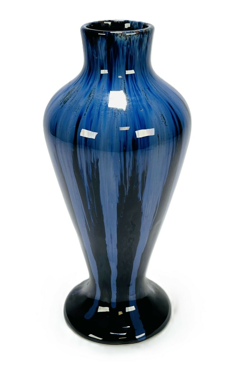 Keramieken Art Deco vaas voorzien van blauw druipglazuur door Mons Pottery. Aan de onderzijde gemerkt en vermelding van modelnummer 268. België, jaren 20-25.