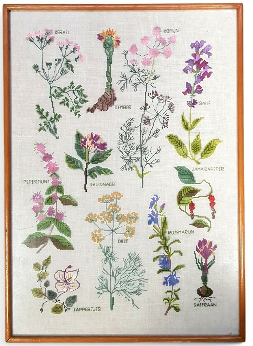 Een merklap met verschillende afbeeldingen van kruiden waaronder pepermunt, kruidnagel en gember. 20ste eeuw.