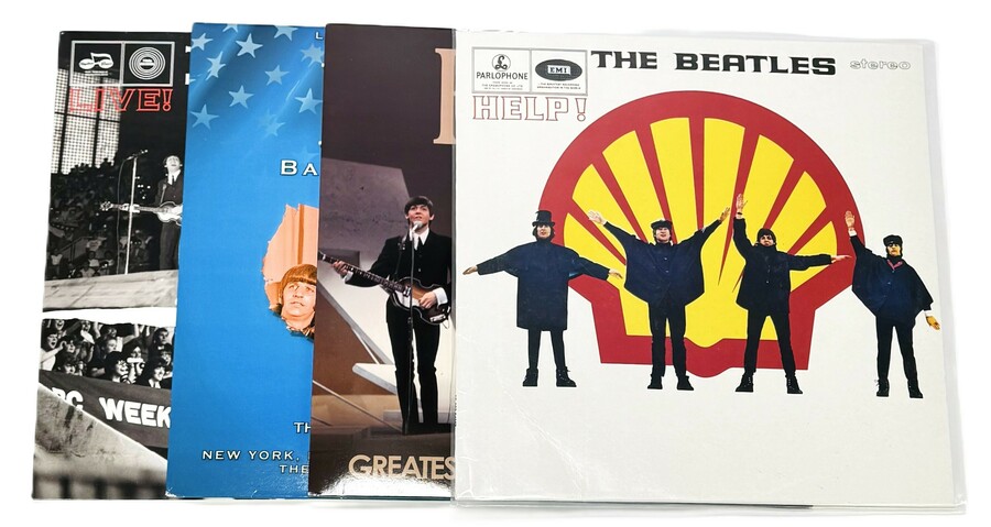 Vier elpees van The Beatles; “Help!” uit 1965, een gelimiteerde uitgave op bruin vinyl van “Greatest Hits live in Air 1963-‘64” uit 2022, “Back in The U.S.A.” uit 2017 en "Live at Wembley & Indiana ‘64” uit 1964.