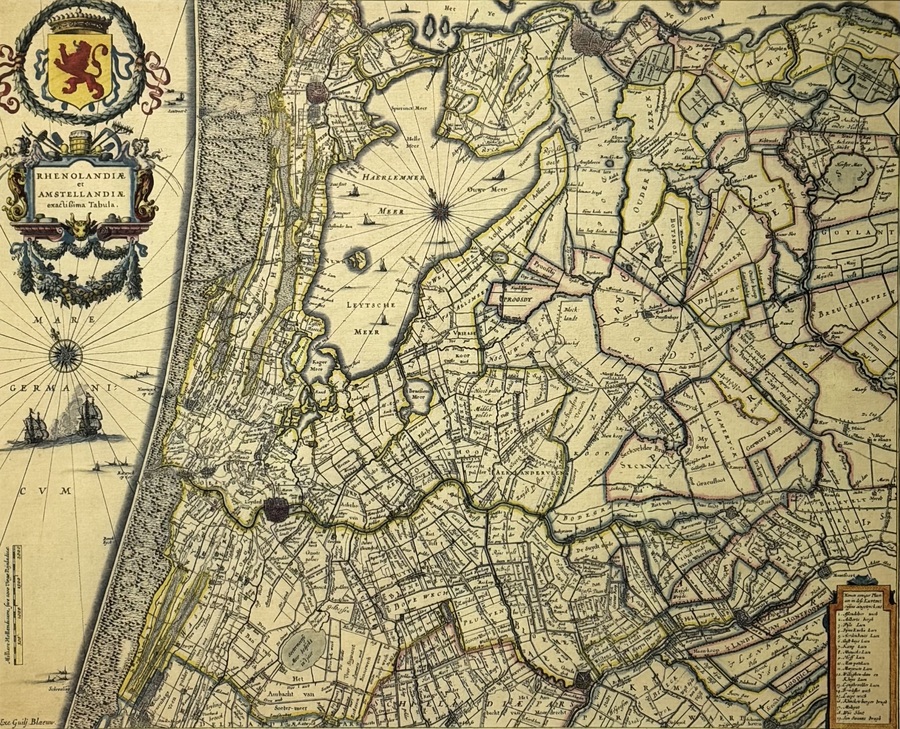 Ingelijste reproductie van overzichtskaart van "Oude kaart Rijn- en Amstelland:" oorspronkelijk uitgegeven door Willem Blaeu te Amsterdam in 1660. 20e eeuw.