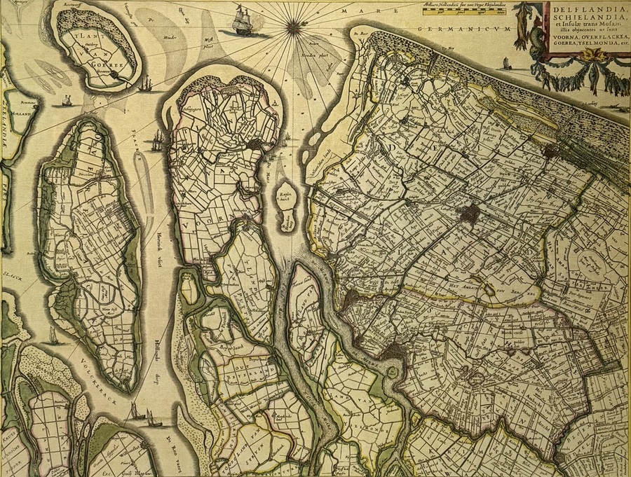 Ingelijste reproductie van overzichtskaart van Delfland, Schieland en de Zuid-Hollandse eilanden oorspronkelijk uitgegeven door Willem Blaeu te Amsterdam in 1638. 20e eeuw.
