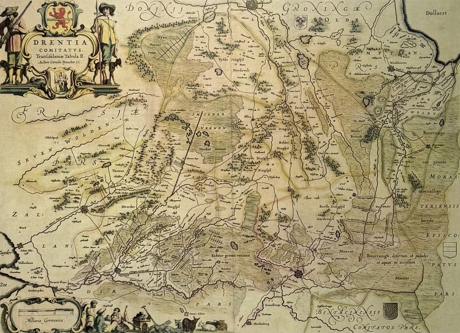 Ingelijste reproductie van overzichtskaart van Drenthe oorspronkelijk uitgegeven door Willem Blaeu te Amsterdam in 1638. 20e eeuw.