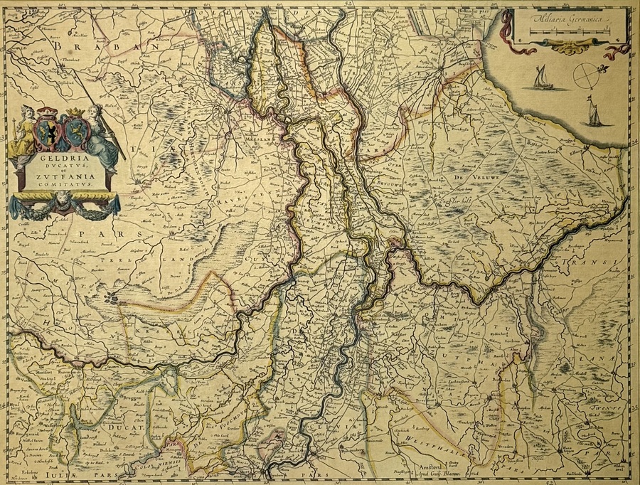 Ingelijste reproductie van overzichtskaart van Gelderland oorspronkelijk uitgegeven door Willem Blaeu te Amsterdam in 1640. 20e eeuw.