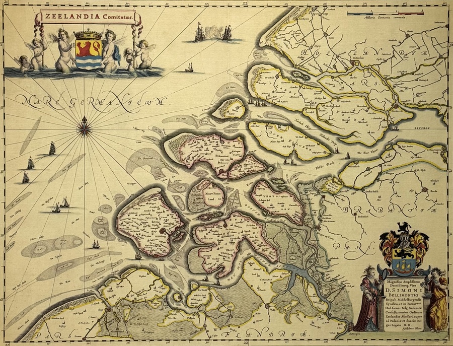 Ingelijste reproductie van overzicht kaart van Zeeland oorspronkelijk uitgegeven door Willem Blaeu te Amsterdam in 1638. 20e eeuw.