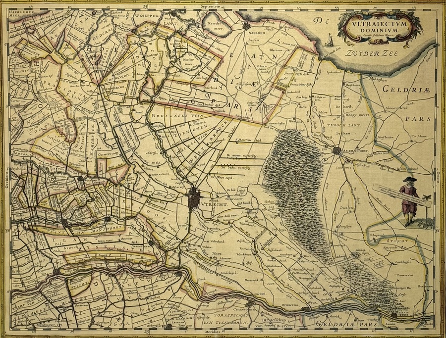 Ingelijste reproductie van overzichtskaart van de Bisdom Utrecht, oorspronkelijk uitgegeven door Willem Blaeu te Amsterdam in 1638. 20e eeuw.