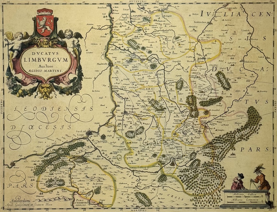 Ingelijste reproductie van de kaart van Limburg "Ducatus Limburgum" oorspronkelijk uitgegeven door Willem Blaeu te Amsterdam in 1638. 20e eeuw.