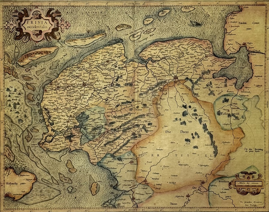 Ingelijste reproductie kaart van Friesland, Groningen en Drenthe, gegraveerd door Gerard Mercator en uitgegeven door Hondius, 17e eeuw. 20e eeuw.