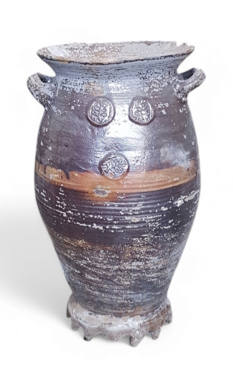 Bruin geglazuurde kroonpot met reliëfdecors en drie medaillons. Langerwehe, 18e eeuw.