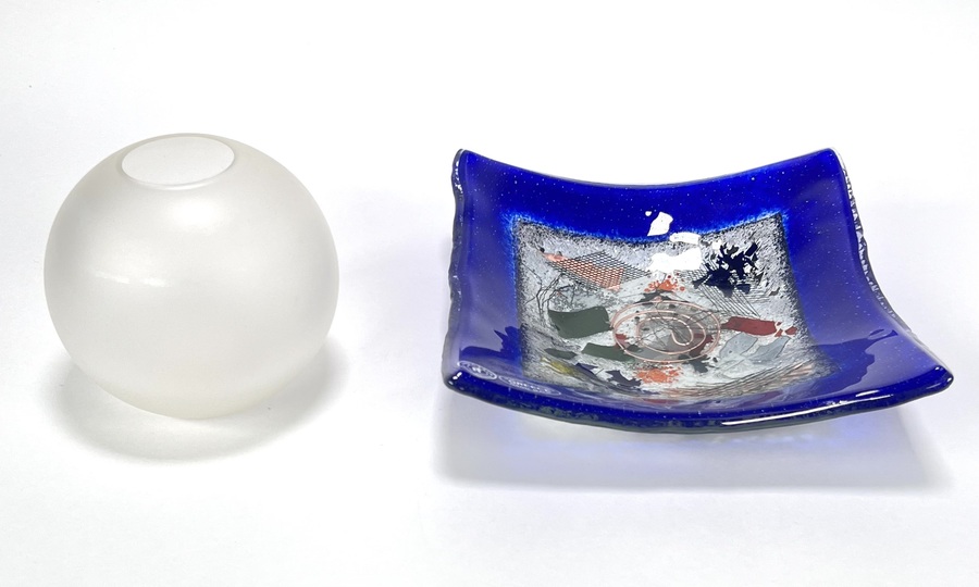 Gesatineerde glazen bolvaas, ontwerp A.D. Copier en uitvoering Glasfabriek Leerdam, geëtst monogram van de ontwerper op de onderzijde. Alsook een Grieks design glazen schaaltje. 20ste eeuw.