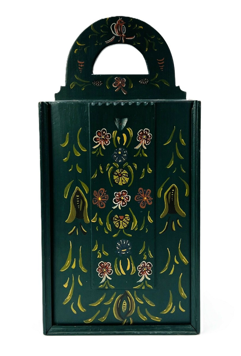 Houten beschilderde schooltas, achterzijde in goudkleurige verf J.A.S. 1907 geschilderd. 20ste eeuw.