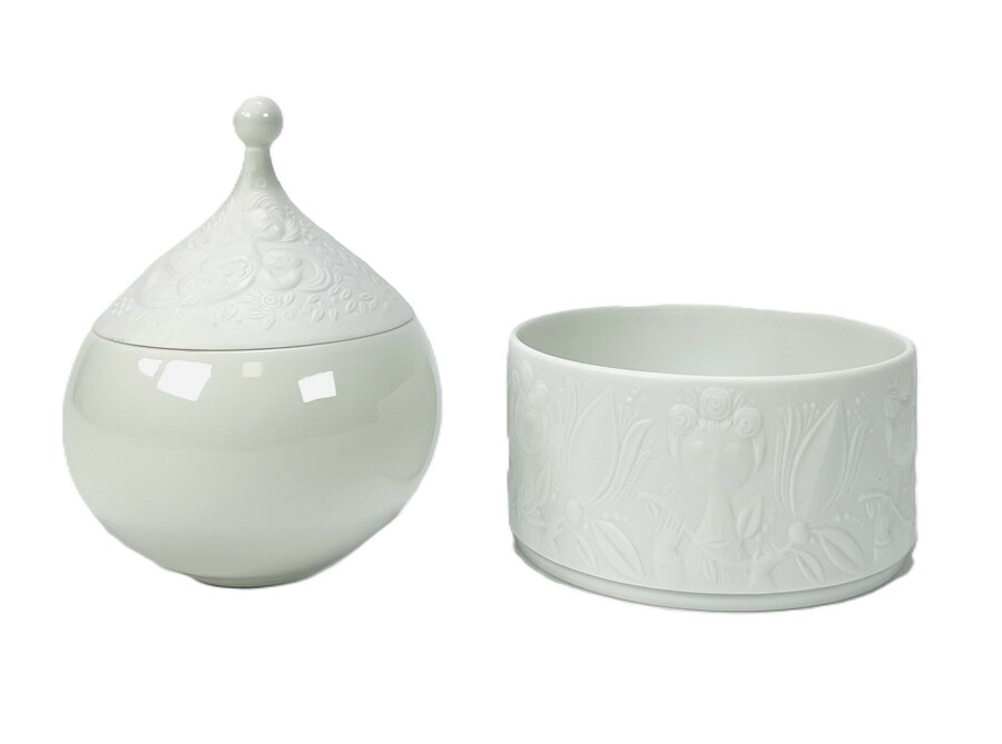 Suikerpot met deksel, Magic Flute Wit van Rosenthal - Continental, samen met een vintage kleine fantasiekom ontworpen door Björn Wiinblad, eveneens voor Rosenthal. Beide gemerkt op de onderzijde. 2e helft 20ste eeuw.