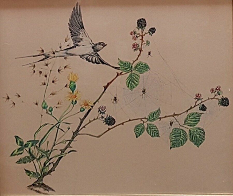 Potloodtekening op papier met gierzwaluw en bramenstruik. 2e helft 20ste eeuw.