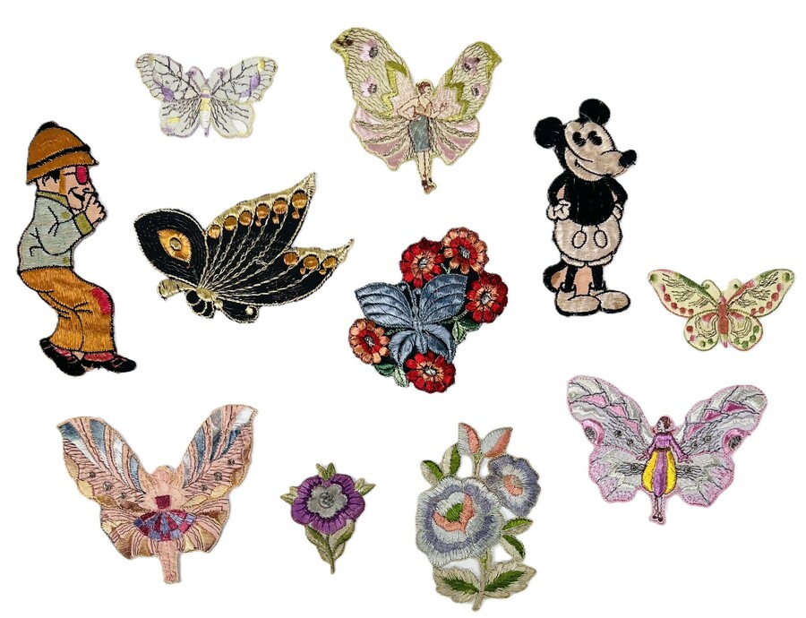 Elf verschillende vintage zijde op katoen applicaties waaronder vlinders, bloemen en een zeldzame Mickey Mouse. Jaren '30.