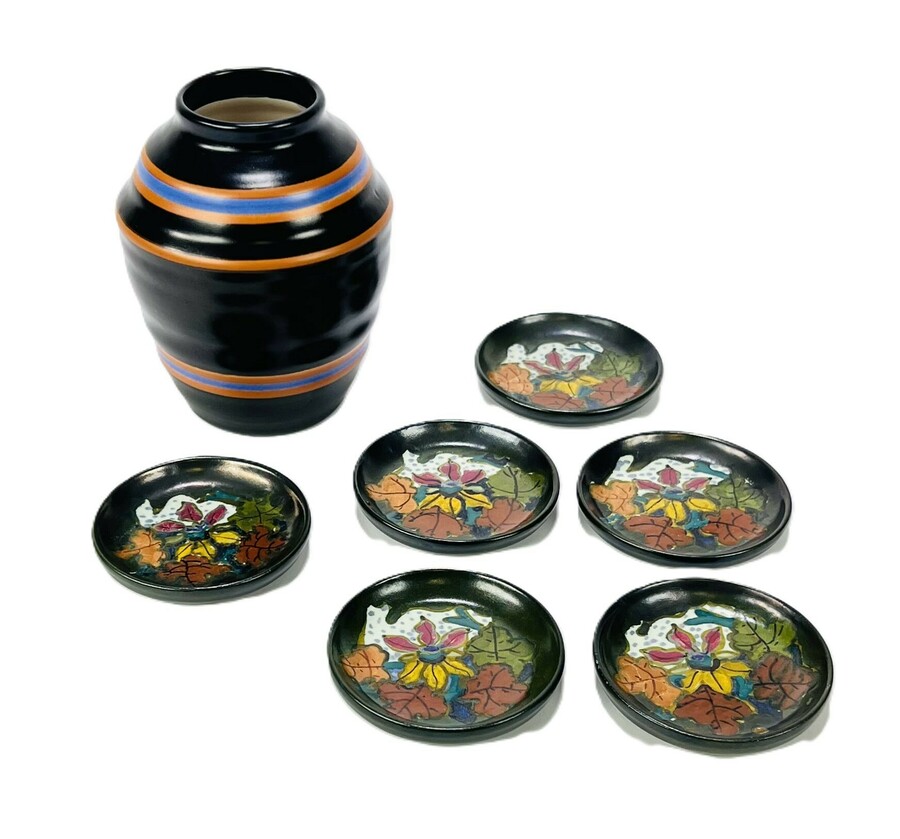 Een plateel vaas door Plateelbakkerij Schoonhoven en zes plateel schaaltjes door Plateelbakkerij Arnhem. Onderzijden gemerkt, eerste helft 20e eeuw.