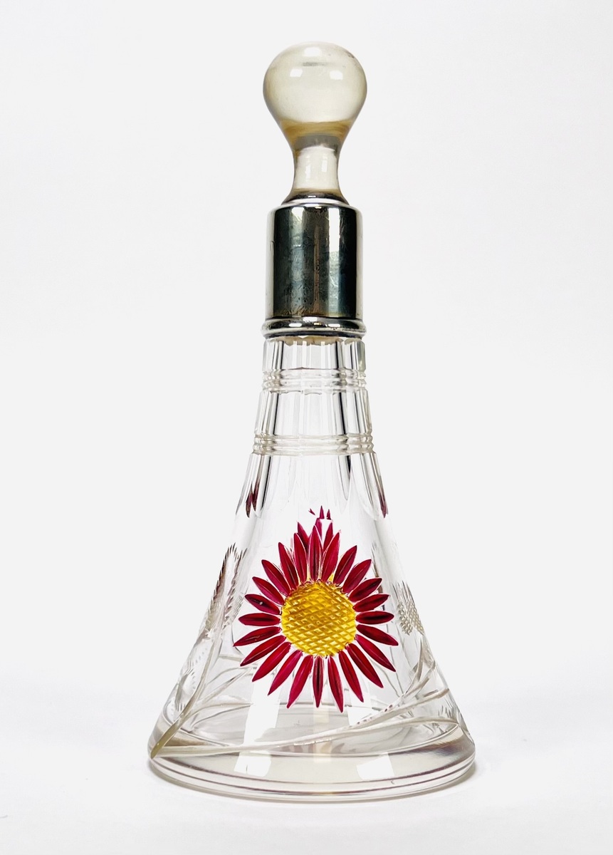 Kristallen parfumflesje, circa 1900–1920, met geslepen florale motieven en handgeschilderde emaille bloemen, voorzien van glazen stop en zilverkleurige montuur. Het conische model en de combinatie van slijpwerk en emaille zijn kenmerkend voor Boheems glas uit deze periode.