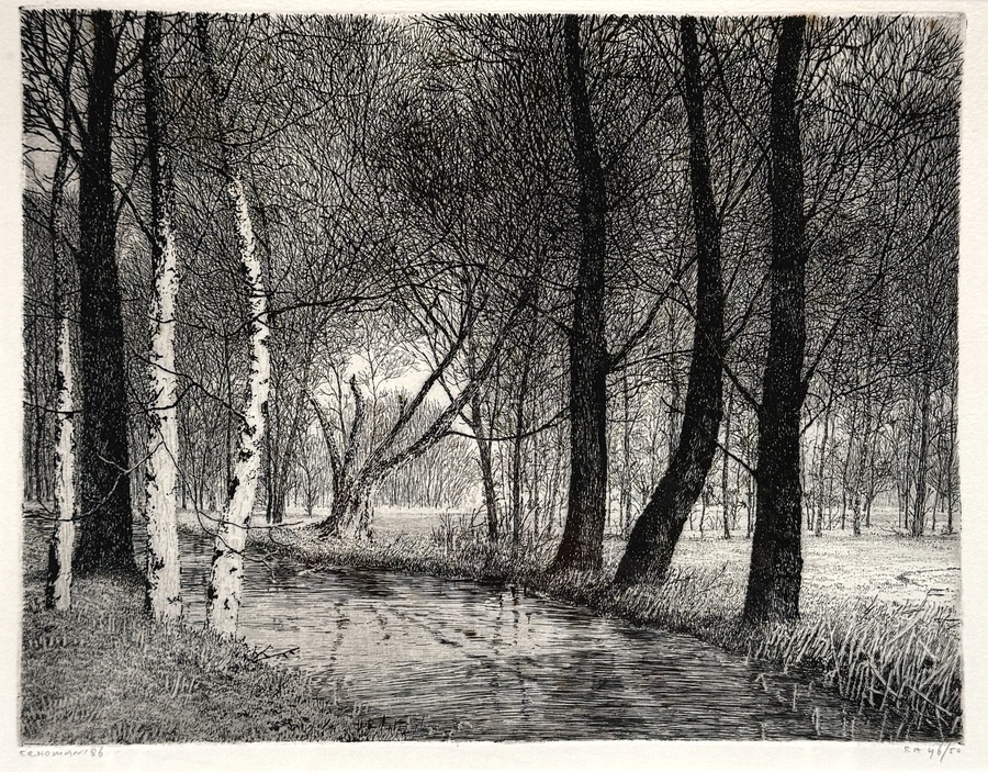 Ets van Reinder Homan (1950), gedateerd 1986, oplagenummer 46/50. Voorstelling van bomen langs een waterpartij, uitgevoerd in verfijnde lijnets op papier. Gesigneerd en genummerd in potlood, ingelijst in metalen lijst met passe-partout.