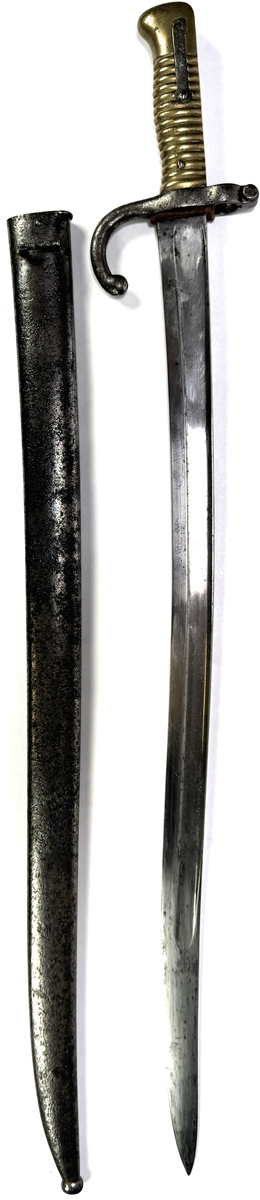 Bajonet met gegraveerde kling “M. Shappek als Cadet Zürich 1868”, derde kwart 19e eeuw. Staal, messing greep, ijzeren schede. Opvallend door persoonlijke inscriptie en karakteristieke groefgreep. Functioneel militaire uitvoering, waarschijnlijk ceremonieel gebruikt door een Zwitserse cadet.