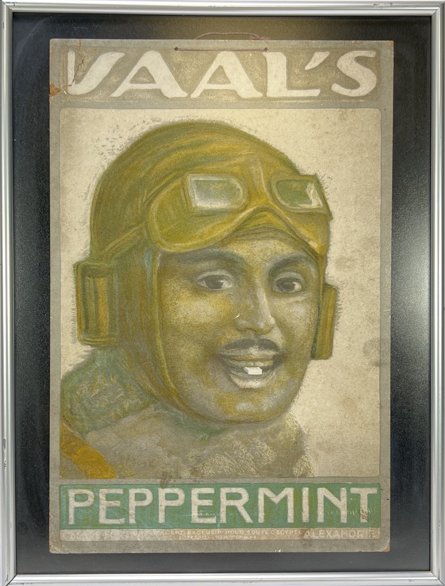 Affiche voor Vaal's Peppermint uit circa 1925, met groot portret van een piloot met bril en helm in groengele tinten. Vroeg voorbeeld van internationale reclamekunst in lithografie, geproduceerd voor export naar Egypte via Alexandrië.