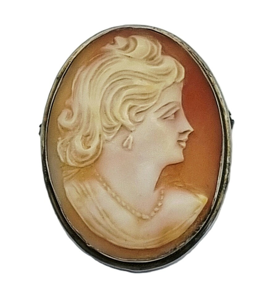 Zilveren broche met camee in de Victoriaanse stijl, daterend uit circa 1900. De broche is gemaakt van camee en zilver, gemerkt met 800. Camee handgesneden hoog reliëf met profielportret van vrouw, met opgestoken haar. Het zilveren frame is voorzien van een naald en sluiting.