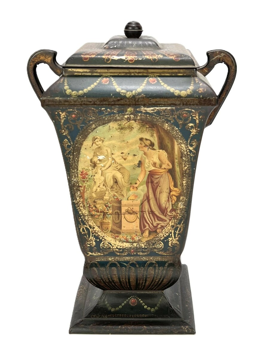 Neoclassicistisch blik, vermoedelijk tweede helft 19e eeuw (circa 1870–1900), gepolychromeerd en verguld met vierkante voet en deksel. Gedecoreerd met klassieke allegorische vrouwenfiguren (muziek, overvloed), omgeven door bloemmotieven en guirlandes.