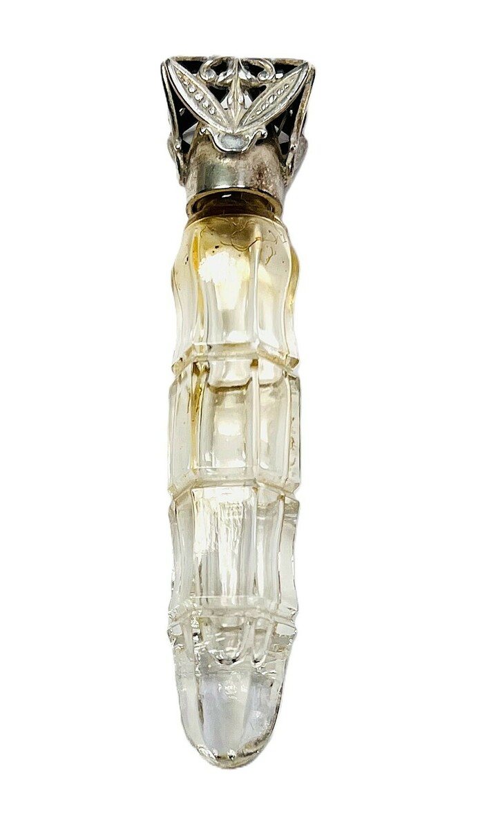 Art Nouveau parfumflesje, circa 1900–1915, geslepen transparant glas met facetten, zilveren opengewerkte dop met florale motieven, geen keuren zichtbaar. Klein formaat, vermoedelijk bedoeld voor reistoepassing.