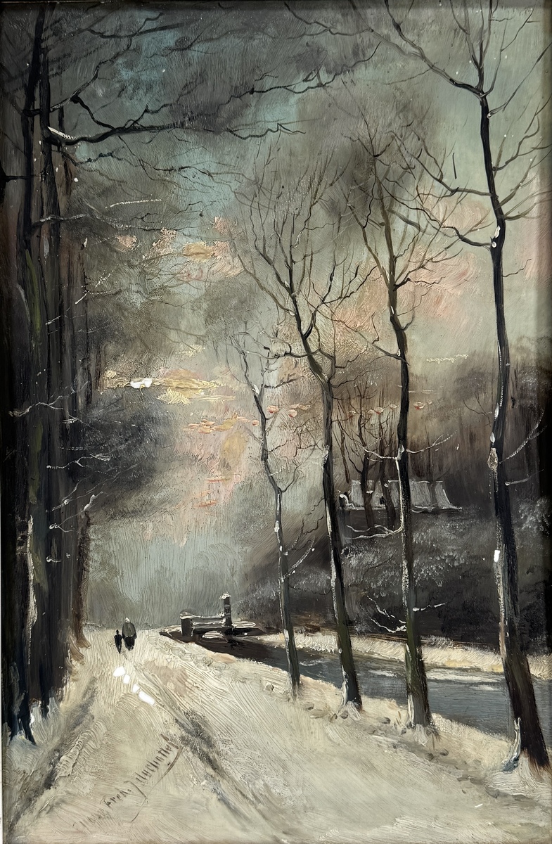 Porseleinen tegel naar Louis Apol, omstreeks midden 20e eeuw, handbeschilderd in realistische stijl. De voorstelling toont een besneeuwd pad met bomen, een kar met paarden en een wandelaar, kenmerkend voor Apols winterse bosgezichten. De tegel is voorzien van een signatuur naar Louis Apol en gemonteerd in een houten lijst.