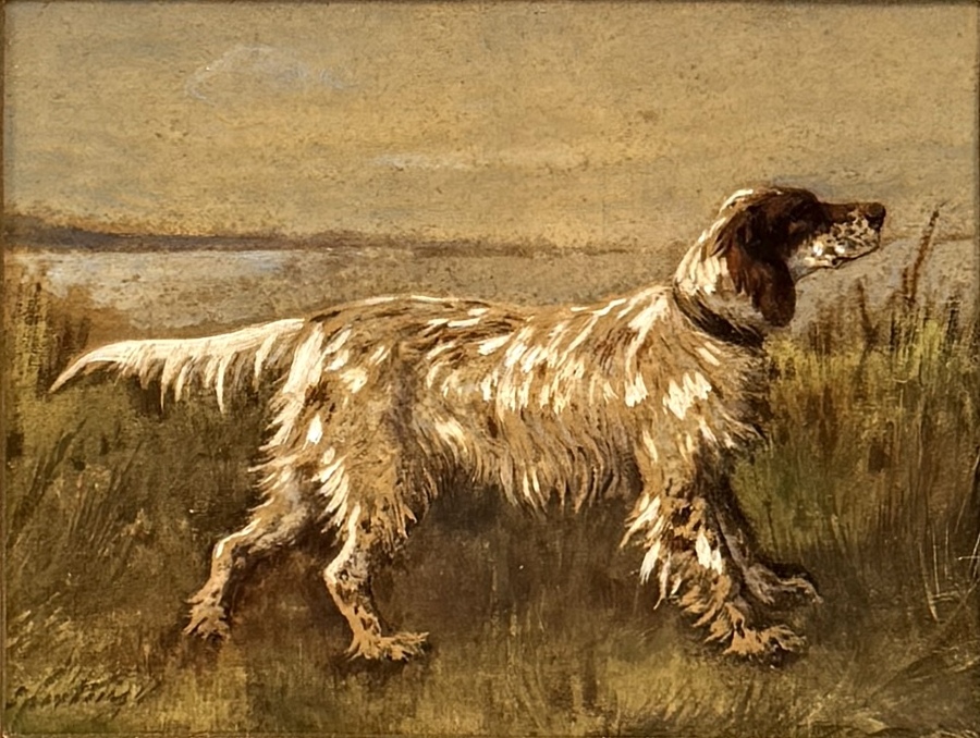 Olieverfschilderij, onduidelijk gesigneerd linksonder, datering eind 19e tot begin 20e eeuw, uitgevoerd op paneel. Het werk toont een staande jachthond in een open graslandschap met subtiele achtergrond. Fijne penseelvoering benadrukt de vacht en lichaamshouding. Herkomstlabel van kunsthandel Goudeket & Co. Amsterdam aanwezig.
