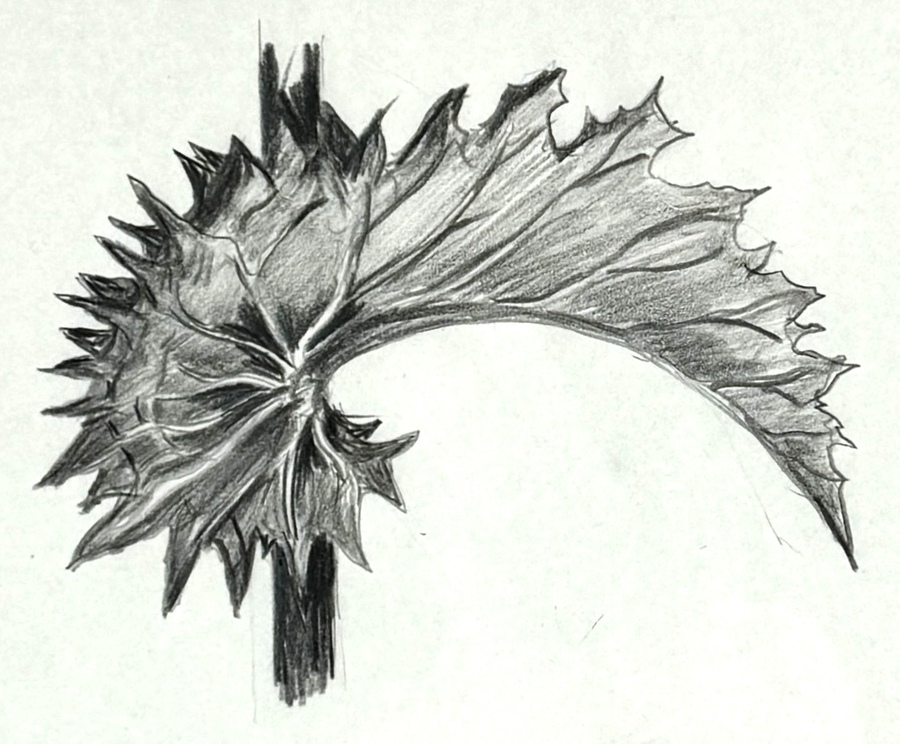 Potloodtekening op papier, omstreeks eind 20e eeuw, naturalistische botanische studie van een gekroonde melkdistel, uitgevoerd in grafiet met gedetailleerde arceringen en accentuering van de stekelige rand. In metalen lijst gemonteerd, voorzien van etiket op achterzijde.